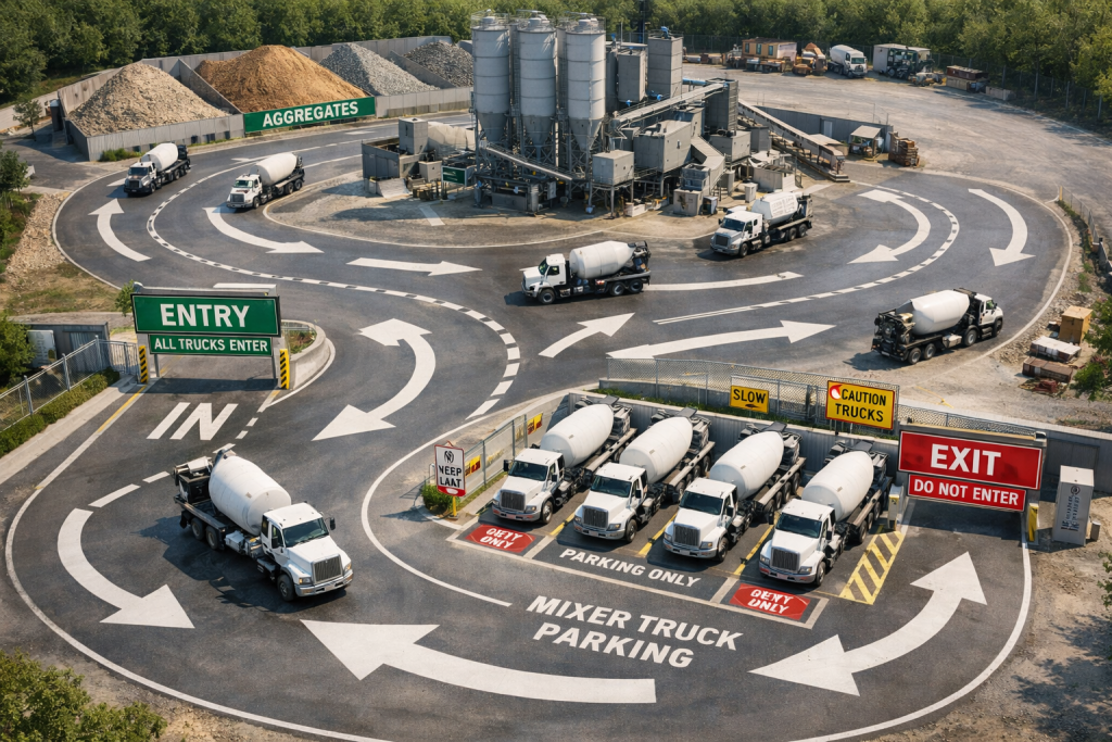 Concrete batch plants have heavy traffic from mixer trucks, aggregate trailers, and other equipment. Design wide roads with separate entry and exit gates to ensure smooth traffic flow. Implement a counterclockwise traffic pattern as it leaves drivers on the same side of stockpiles, promoting safety and visibility. Provide sufficient space for mixer trucks to pass through and park, and use good signage to prevent haphazard parking that could obstruct your site.